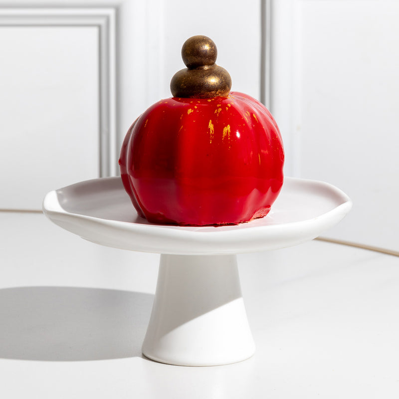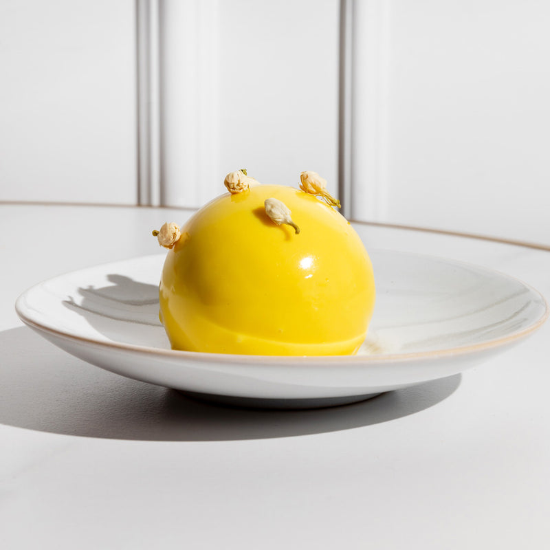 Airy hazelnut mousse layered with vibrant yuzu caramel and silky yuzu filling over a tender madeleine sponge, finished with a delicate white chocolate crunch
